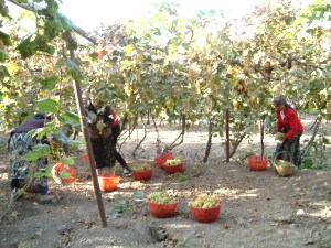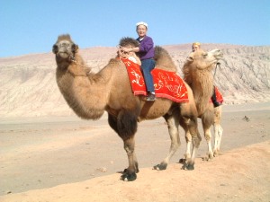 ここで突然、記念写真を撮るからラクダに乗れと言われ初めて乗ってみました。ラクダの背は意外に高く、ラクダが歩くたびに大きくゆられてしまうので、振り落とれないかと、目の前のコブに必死でしがみついて何とか写真のモデルになることが出来た。この山では日中気温が40℃を超えると地表温度は70℃以上にもなるそうです。激しい炎が立ち昇るようにみえると聞いたが現地に立ってみると想像していたより温和な感じで山肌もあまり赤く無く熱さもそう感じないのは季節のせいかなと思った。西域の風に吹かれ砂と青空を眺めつつトルファンに戻りました。