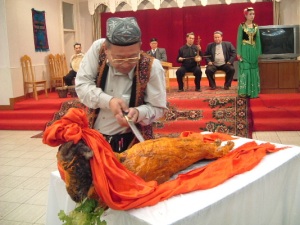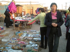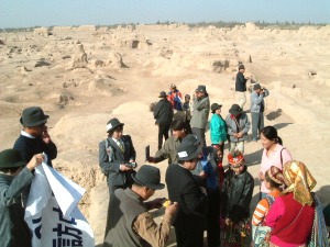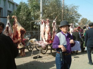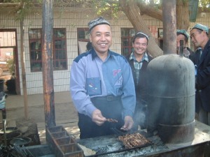 | 高昌故城からの帰りに日干し煉瓦を積み上げた家が並ぶ町の十字路でバザールに立ち寄った。市長の発案らしいがこのような地元の生の交流体験はとても貴重でした、衣服や野菜、ガラクタのような金物の販売から羊の生肉を2〜3匹下げて販売している風景などを見物した。途中で羊肉の焼き鳥屋台があり早速市長自らがウイグル族の焼き鳥屋さんに変身して串焼きをふるまったが・・なかなか美味しい味でした。