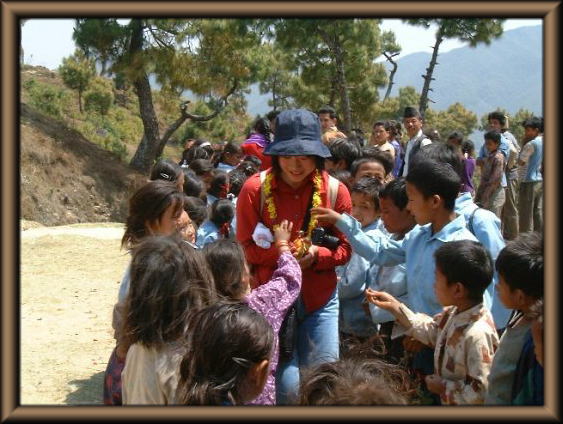 学校に到着すると子供達が花と手作りの花輪で歓迎してくれました。