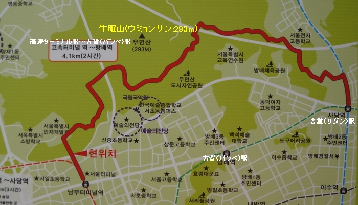 今日は天気も良い、地下鉄2号線の南部ターミナル駅で下車して5番出口を出て少しあるくとコンサートやミュージカルが行われる芸術の殿堂(イェスレチョンダン)がある大通りに出る。この通りの向こう側の山が牛眠山(ウミョンサ:293m)で全体が山であり公園でもある。