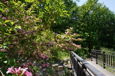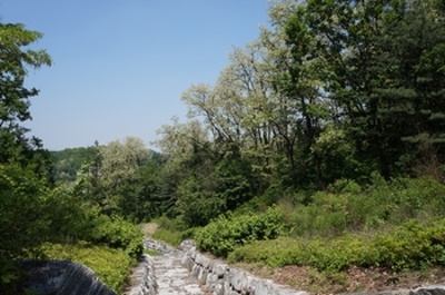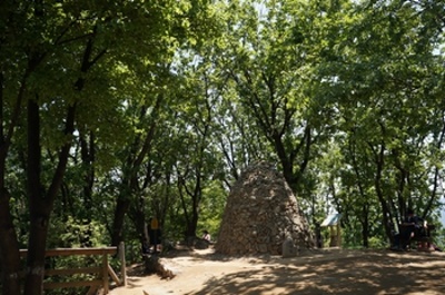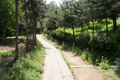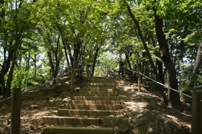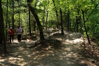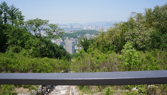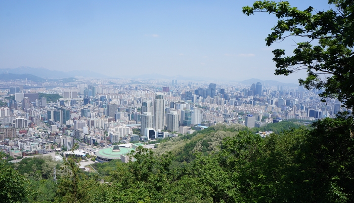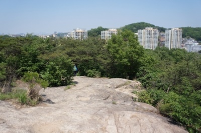 この時期、若葉が生い茂る中を鳥のさえずりを聞きながら歩くのはとても気持ちが良い。休日でないから出会う人は近くの住居地区に住む自由な時間がとれる中高年齢者がハイキングを楽しんでいる。一時間程で山頂に着くと眼下はソウル市内が一望出来た。